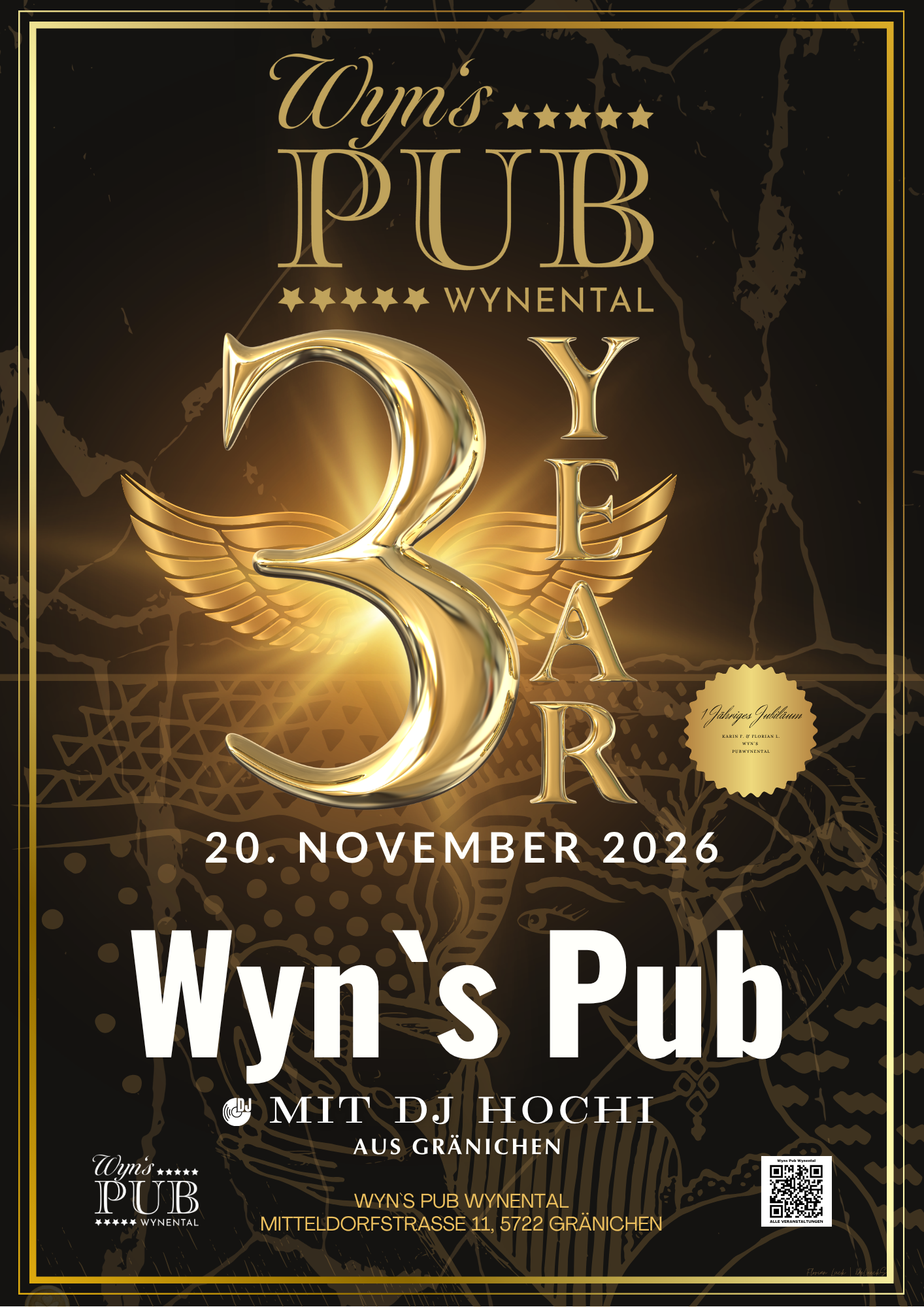 2 Jahre Wyn`s Pub mit DJ Hochi Das Wyn’s Pub Wynental lädt Sie herzlich ein, sein 3-jähriges Bestehen zu feiern! Am Freitag, 20. November 2026, öffnen sich unsere Türen [...]